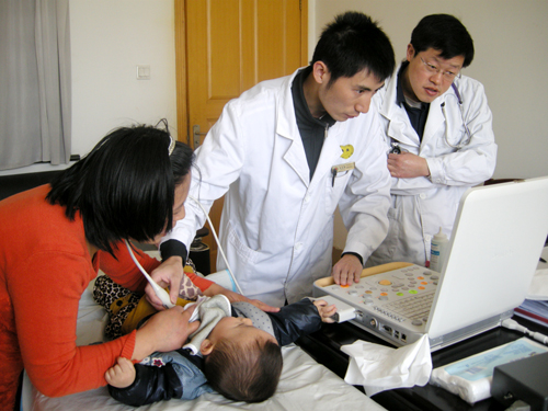 (图为武汉亚洲心脏病医院专家为患儿做详细检查)