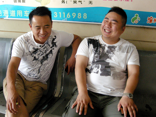 (图为留爱不留名的好心人——邱鹏伟(右)和他的朋友李军(左)在接受采访时,“羞涩”地笑了)