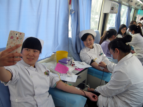 第一次参与无偿献血的新职工自拍留念