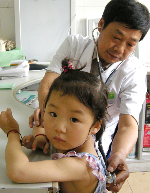 (图为市妇幼保健院儿科主任胡炳堂为感冒患儿听诊)