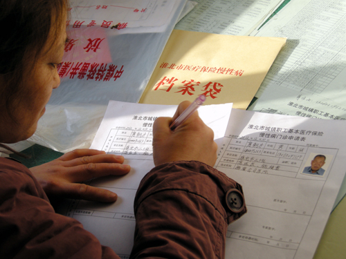 (图为慢性病患者家人在市妇幼保健院内科医生指导下规范的填写申请表)