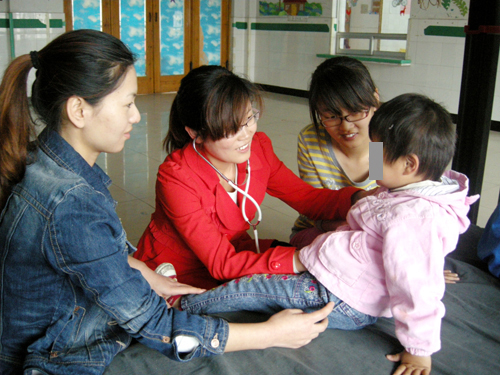 来到市福利院二楼儿童部干净宽敞的房间,孩子们一点儿也不怕生,纷纷聚拢过来,护士姐妹们也情不自禁地上前,和孩子们交流起来,她们有的抱着孤儿亲吻、有的和孩子们聊天、有的为小朋友测体重、量身高、听诊等等,瞬间,浓浓的爱意溢满了福利院儿童部。这些孩子虽然没有父母的亲情之爱,但幸运的是孩子们得到了社会大家庭的关注,得到了福
